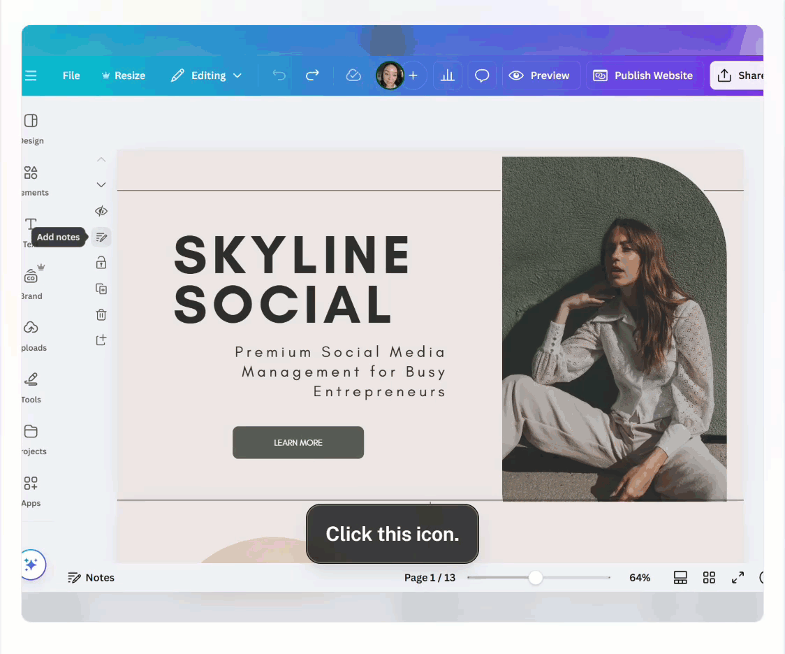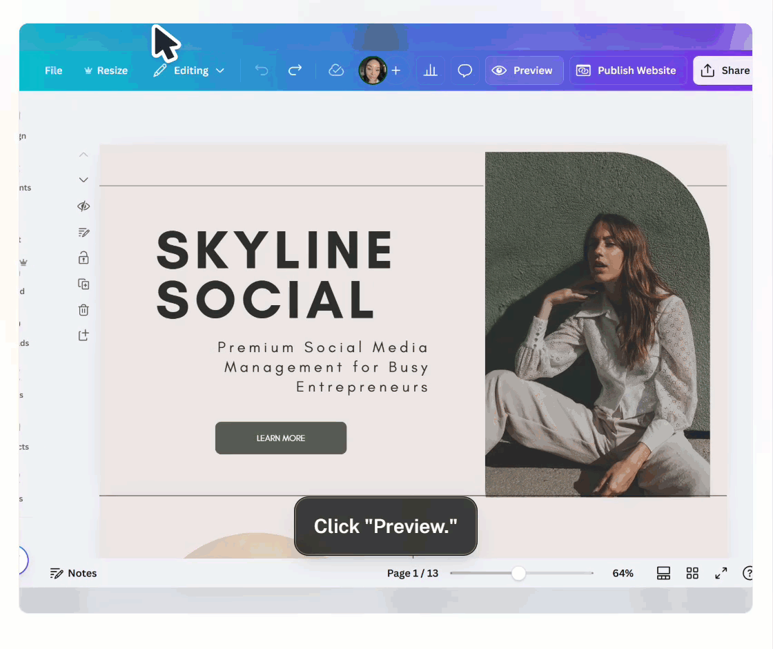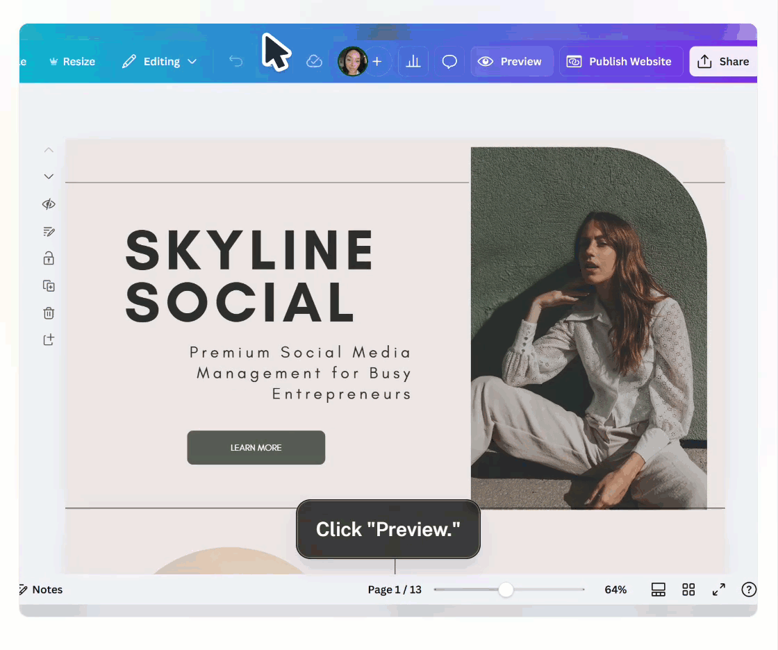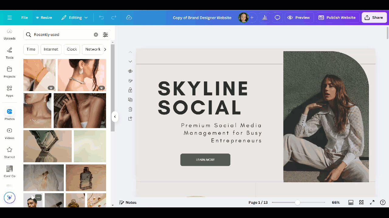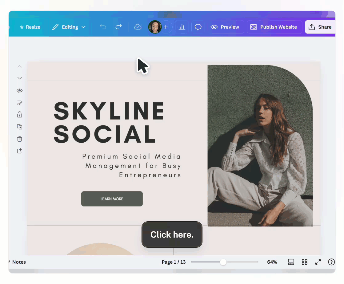 You can edit your domain name to personalize it to your brand. You can use a free Canva domain, or pay for a custom domain. I demonstrate how below.
