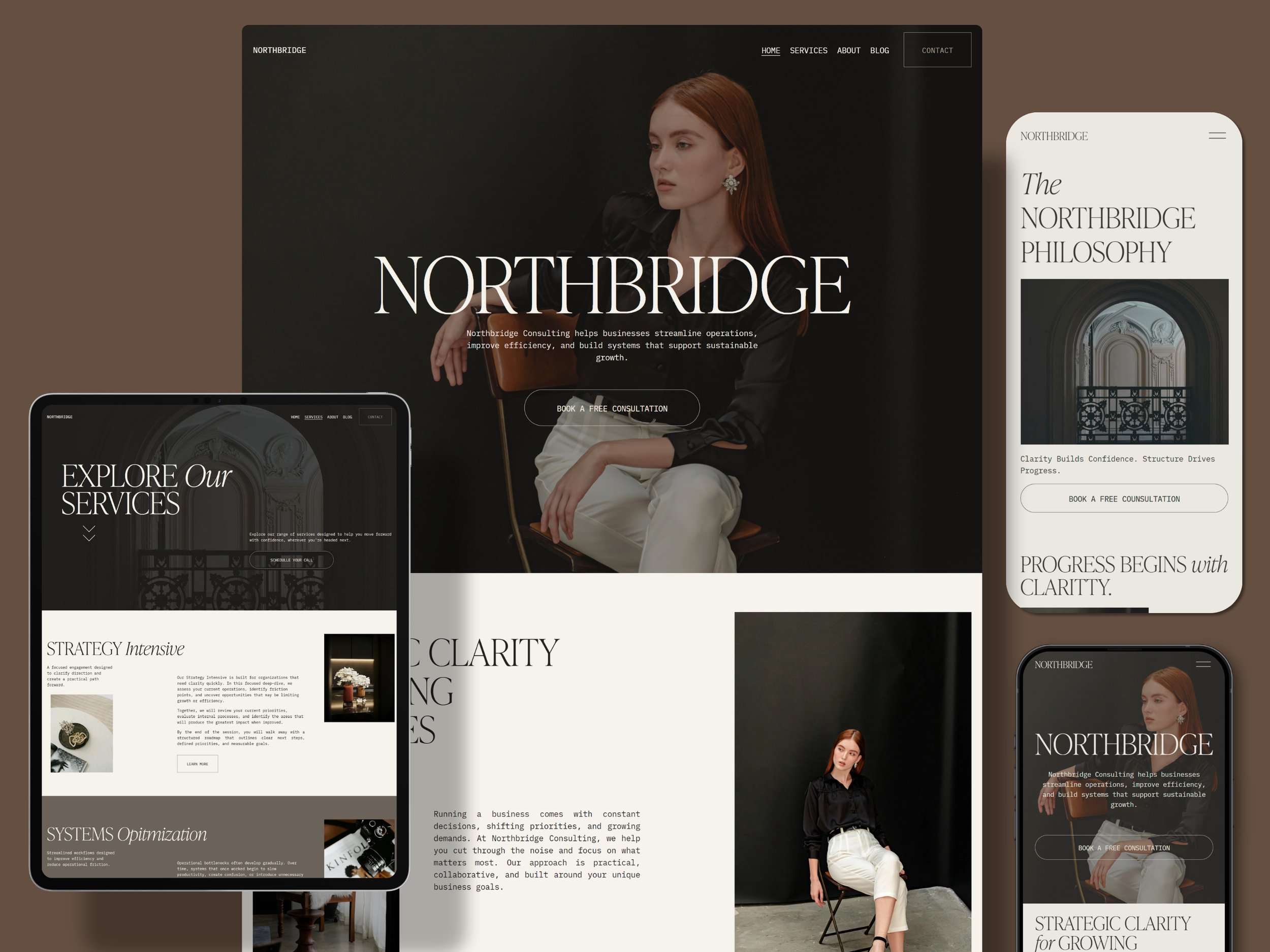 Northbridge combines bold editorial typography, a rich dark hero section, and warm cream interiors to create a site that feels established, authoritative, and considered from the very first scroll. It is the kind of website that makes potential clients feel like they are already in good hands.